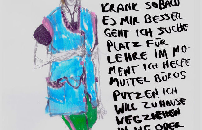 Depuis 2012, Clemens Wild fait partie de l’atelier Rohling, un collectif d’artistes avec et sans handicap basé au PROGR de Berne. Dans ses dessins, Clemens Wild documente sa vie de tous les jours dans le home où il réside, à travers un mélange de textes et images. Il représente aussi des tranches de vie de personnes simples et marginales, en se faisant par là le porte-parole d’une véritable critique sociale. Comme lui, ses personnages pointent souvent du doigt les stratégies de marginalisation et de discrimination. Les dessins et les textes de Wild offrent une visibilité aux personnes qui vivent dans l’ombre. Une série de dessins en format mondial est consacrée aux femmes de ménage. Wild veut montrer à tout le monde que « elles sont là, elles aussi. Sans elles, nous nagerions dans les ordures ». Avec des mots clairs et des images subtiles, l’auteur proteste contre les conventions bourgeoises, le conformisme et le mépris en général que la société montre pour les personnes en situation de handicap ». Klaus Macherlein. Extrait du catalogue Euward 2018.
